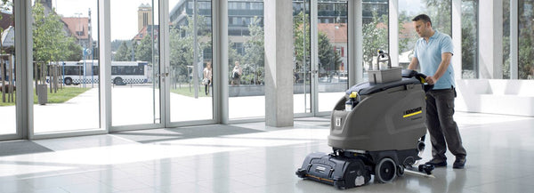 Auf mittelgroßen Flächen, wie im Handel, in Schwimmbädern, Hallen sowie Gängen und auf Fluren vieler Einrichtungen, eignen sich Nachläufer-Scheuersaugmaschinen zur effizienten Reinigung.