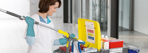 Ordnung und Sauberkeit: Ein Reinigungswagen hilft dabei, alle notwendigen Reinigungswerkzeuge und -materialien organisiert und griffbereit zu halten.